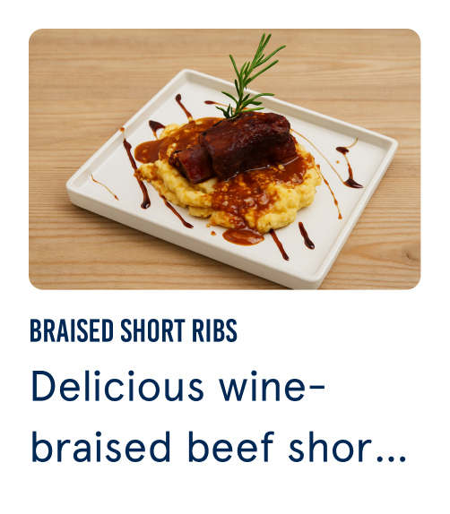 Delicious wine-braised beef short ribs. With thyme, fried garlic, cabernet, sweet onion and carrots.
