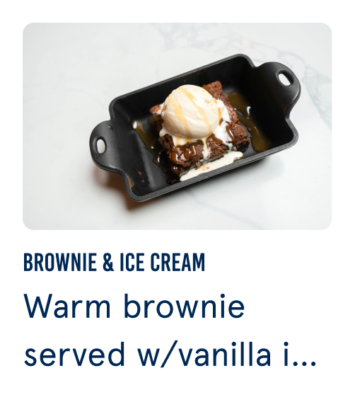Warm brownie served w/vanilla ice cream & caramel drizzle, perfect to end the evening.