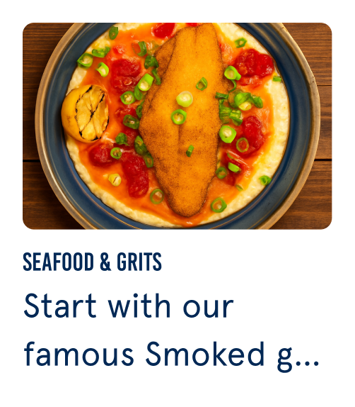 Start with our famous Smoked gouda grits with shallot, tasso ham, charred lemon and tomato chutney.