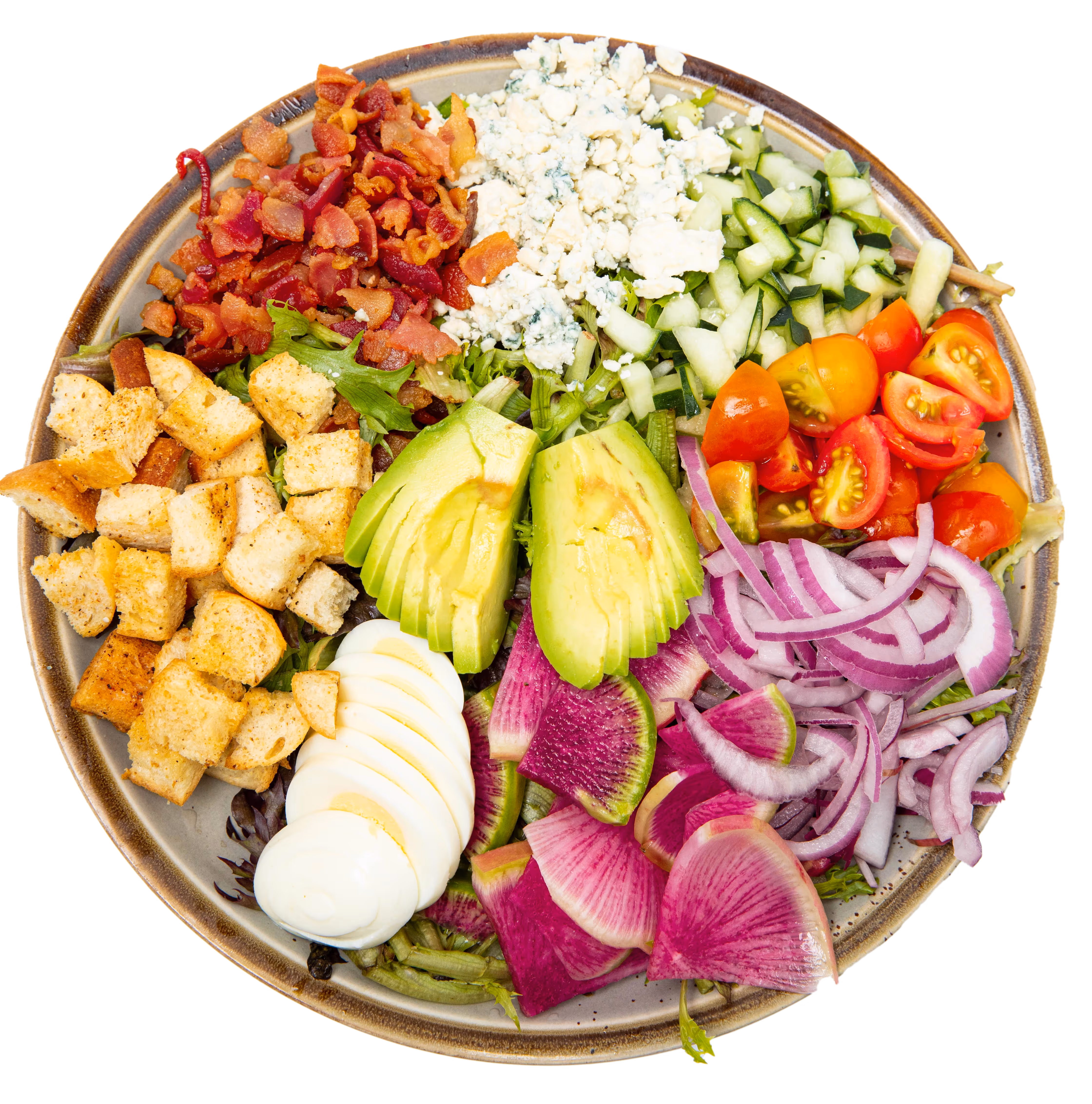 Red onion, bleu crumble, sliced boiled egg, cucumber, watermelon radish, applewood bacon, tomato, spring mix, croutons, avocado