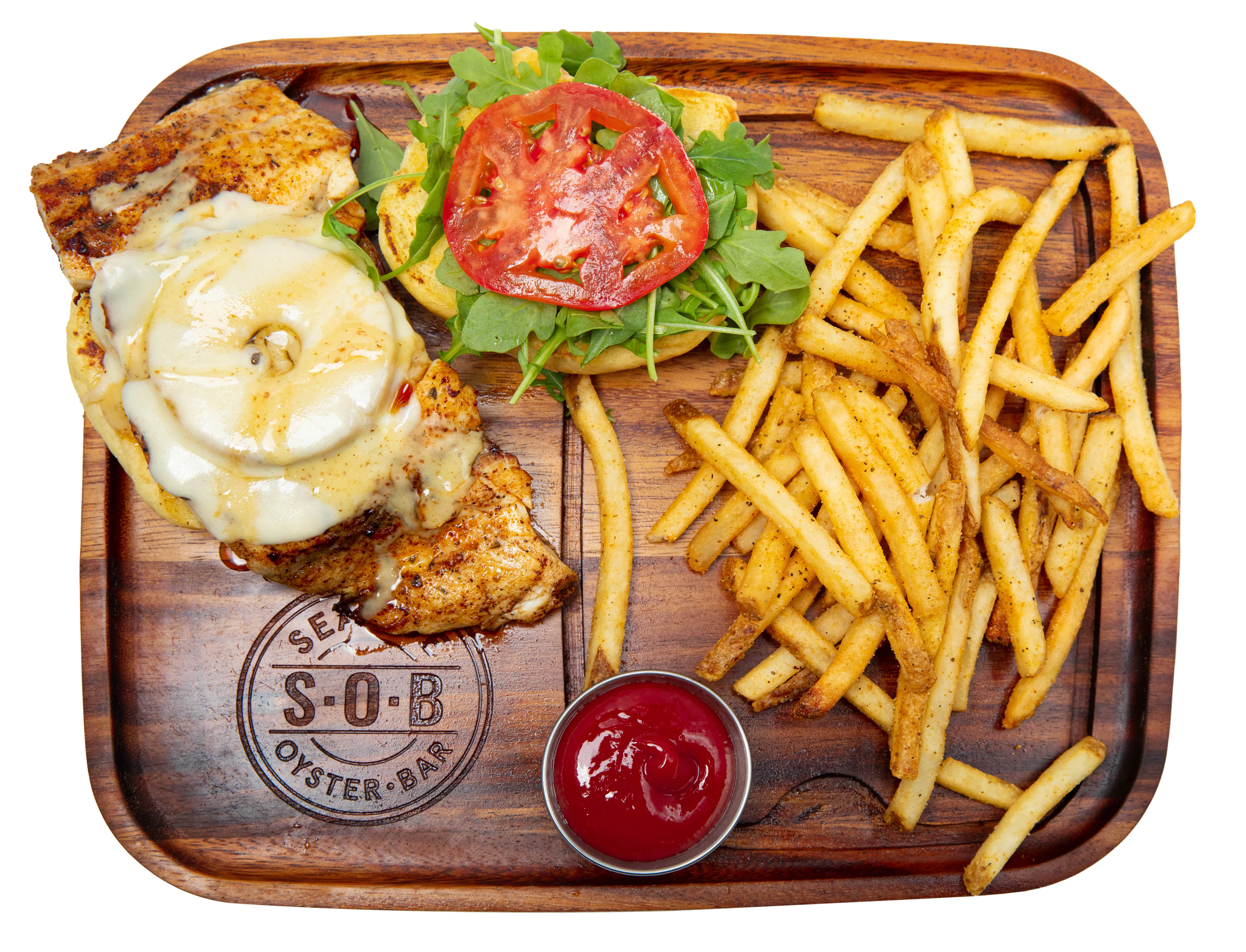 Blackened chicken breast, arugula, honey mustard, tomato, grilled pineapple, brioche bun, provolone, sweet ginger soy