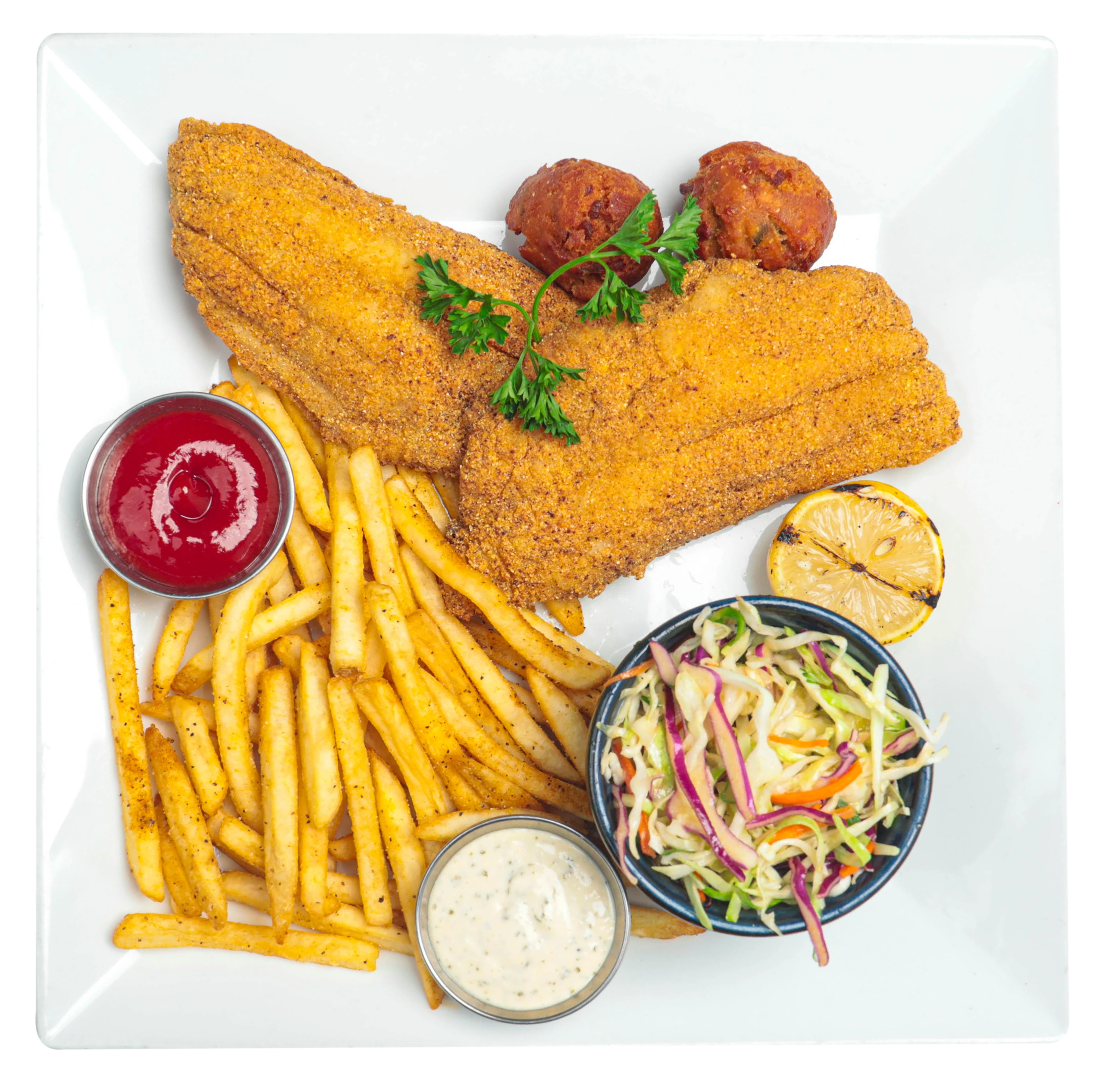 Crispy cornmeal breaded filets, smoked tartar. Served with slaw, fries and hush puppies.
