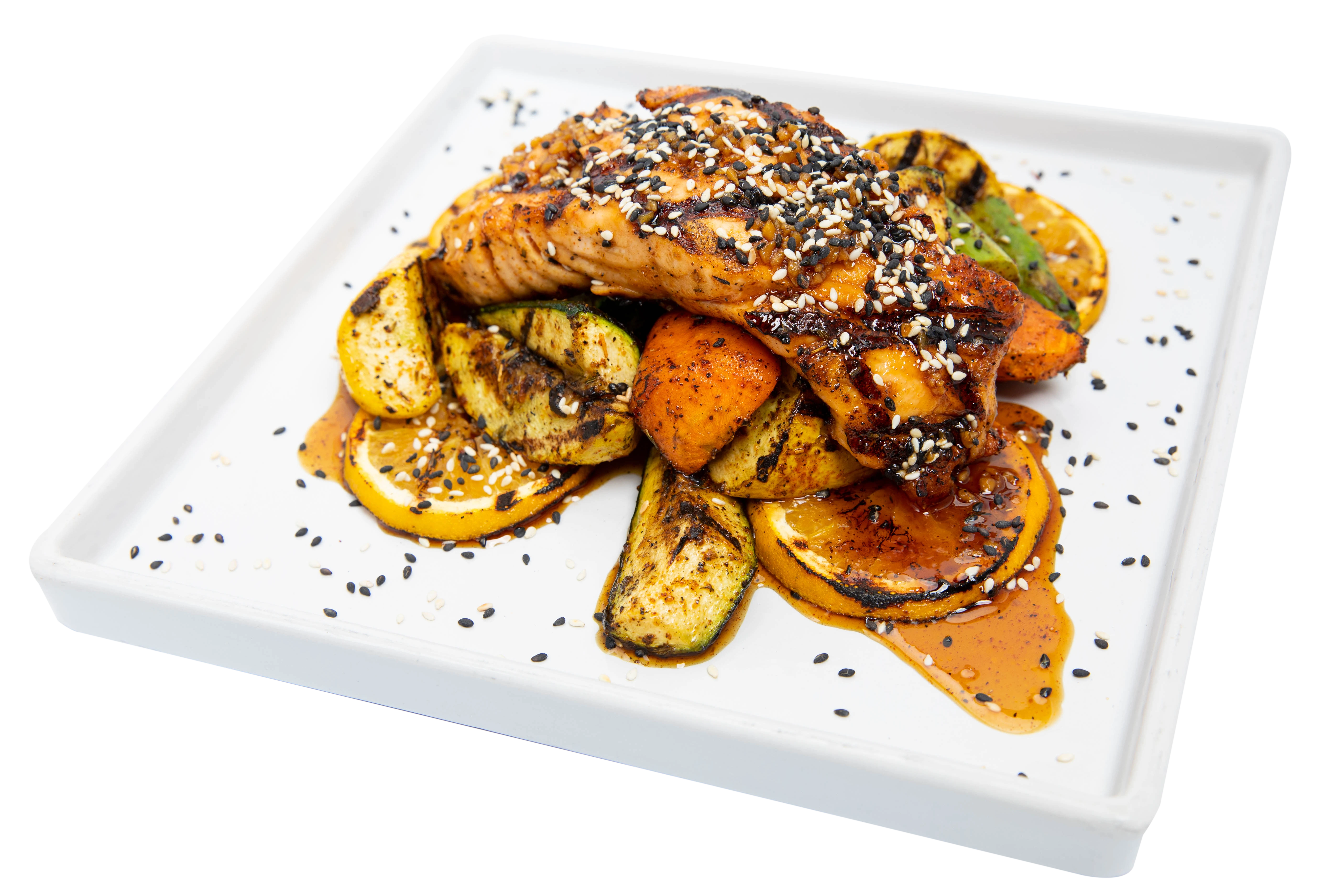 Toasted Sesame, Sweet Soy Ginger, Charred Orange, Crisp Garlic, Over Bed Of Seasonal Veggies, Served W/ Side Salad & White Rice