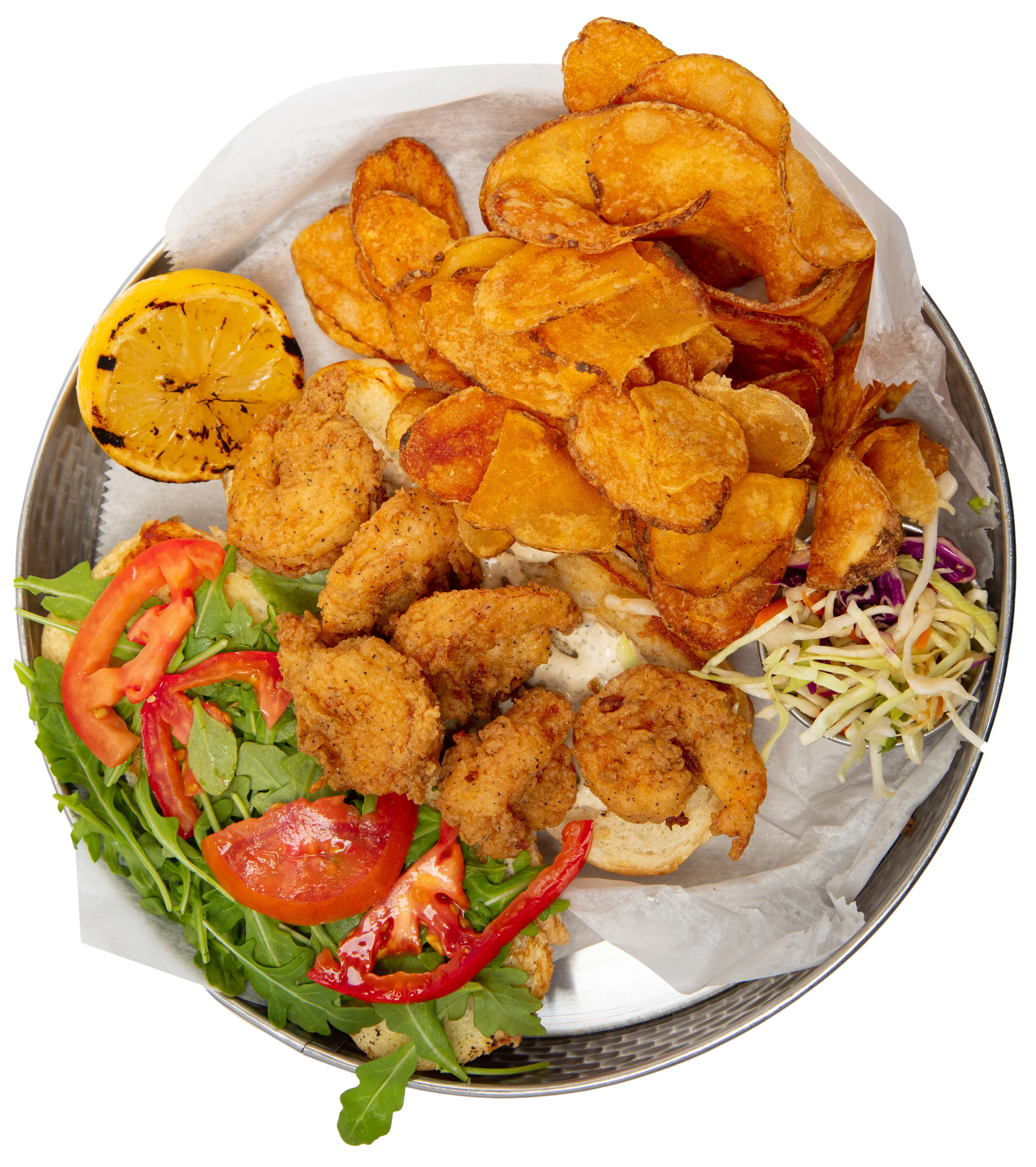 your choice of 1 fried: shrimp - oyster - catfish - chicken tenders tomato - arugula - tartar sauce - french bread served w/ viet slaw**