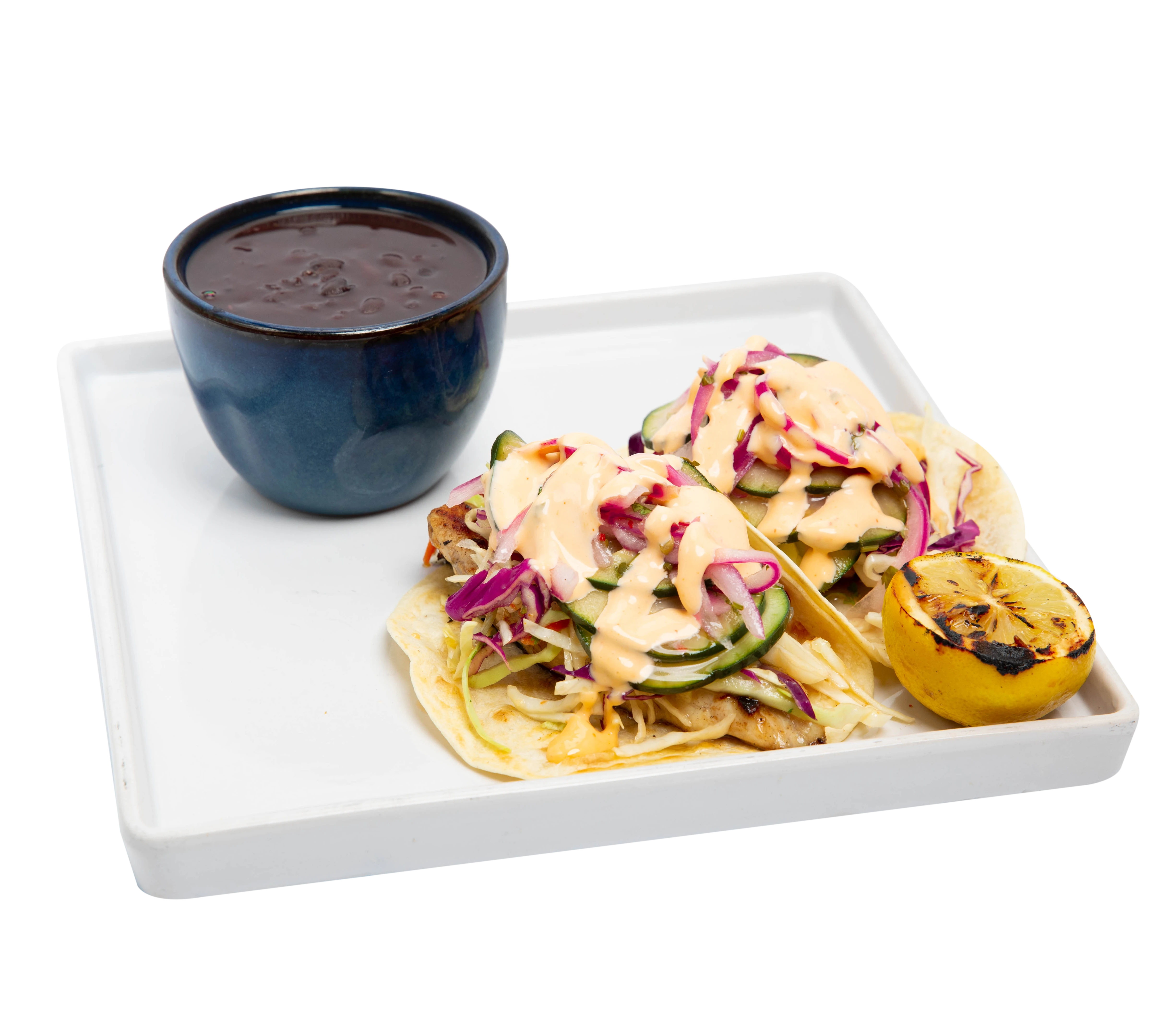 Viet slaw, ginger dressing, sriracha aioli, cucumber, pickled onions, corn/flour tortilla. Served with black beans.